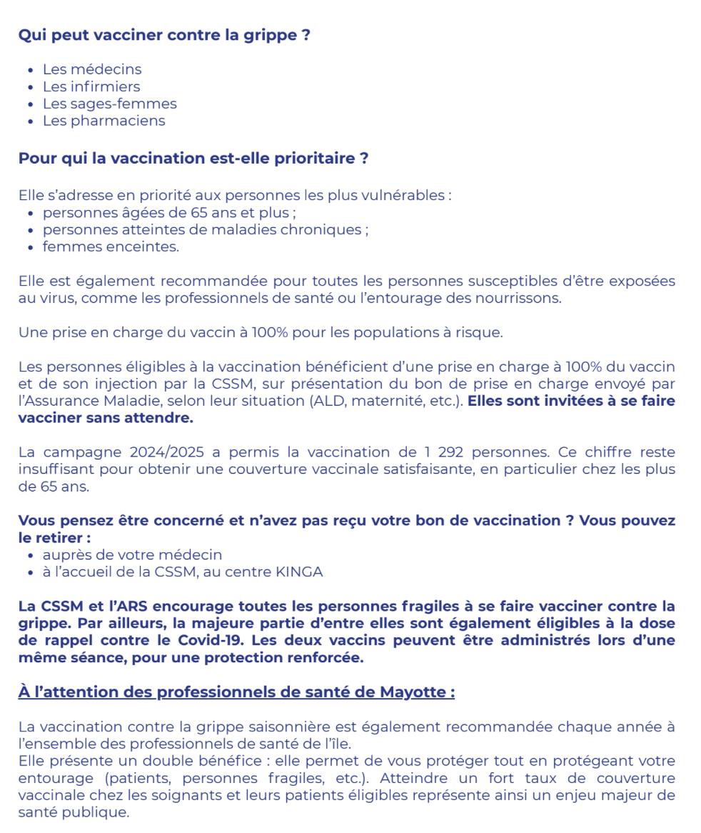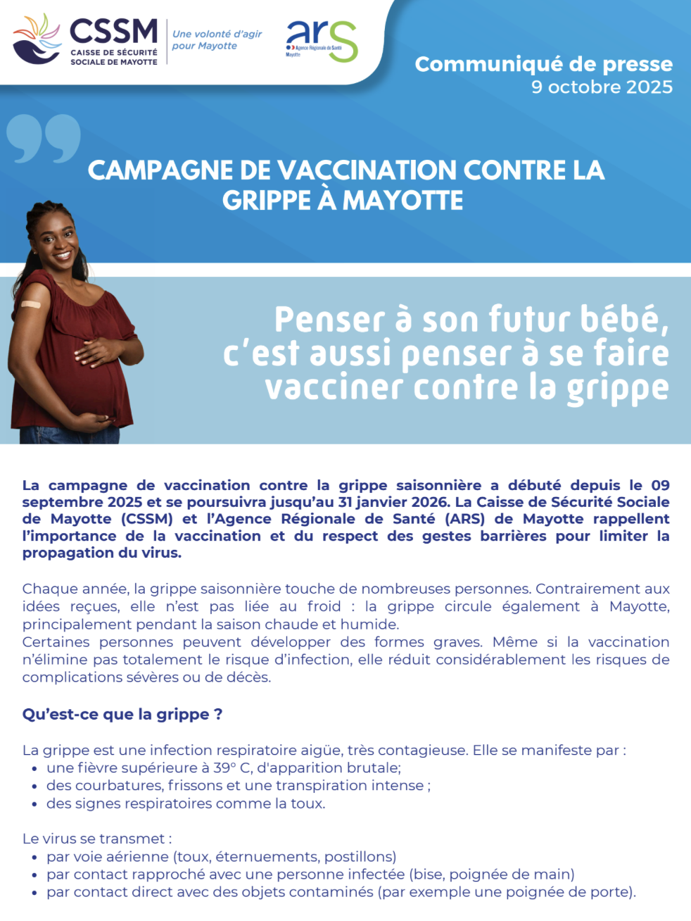 AccueilFil infoGrippe : La campagne de vaccination a démarré à Mayotte Grippe : La campagne de vaccination a démarré à Mayotte Fil infoUne Publié le 9 octobre 2025 par La rédaction info976 FacebookTwitterPinterestWhatsApp Derniers articles Une SMAE : Coupure d’eau à Mamoudzou et dans le Nord de l’île La SMAE informe la population, ce dimanche 9 novembre, que les usagers des secteurs... 9 novembre 2025 Fil info À Mamoudzou, l’église Notre-Dame-de-Fatima profanée À Mamoudzou, l’émotion est vive dans la communauté catholique. Cette semaine, l’église Notre-Dame-de-Fatima a... 8 novembre 2025 Fil info Violences autour du Lycée des Lumières : la FCPE Mayotte appelle à une action forte et immédiate "La Fédération des Conseils de Parents d’Élèves (FCPE) de Mayotte exprime sa profonde inquiétude... 8 novembre 2025 Fil info Lycée des Lumières : après les violences, les cours reprendront mercredi 12 novembre "Jeudi 6 novembre, enfin de matinée, aux alentours de midi, de violentes attaques ont... 8 novembre 2025 Plus d'articles Une SMAE : Coupure d’eau à Mamoudzou et dans le Nord de l’île La SMAE informe la population, ce dimanche 9 novembre, que les usagers des secteurs... 9 novembre 2025 Fil info À Mamoudzou, l’église Notre-Dame-de-Fatima profanée À Mamoudzou, l’émotion est vive dans la communauté catholique. Cette semaine, l’église Notre-Dame-de-Fatima a... 8 novembre 2025 Fil info Violences autour du Lycée des Lumières : la FCPE Mayotte appelle à une action forte et immédiate "La Fédération des Conseils de Parents d’Élèves (FCPE) de Mayotte exprime sa profonde inquiétude... 8 novembre 2025