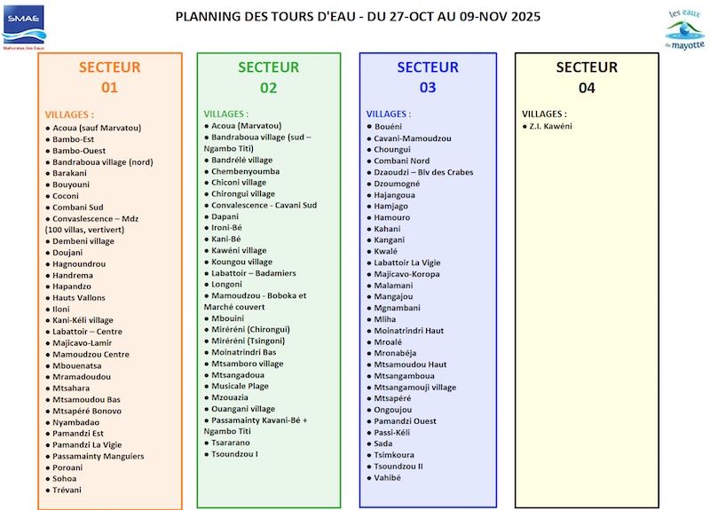 AccueilFil infoPLANNING DES TOURS D'EAU DU 27 OCTOBRE AU 9 NOVEMBRE 2025 PLANNING DES TOURS D’EAU DU 27 OCTOBRE AU 9 NOVEMBRE 2025 Fil infoSociété Publié le 24 octobre 2025 par La rédaction info976 FacebookTwitterPinterestWhatsApp Derniers articles Une SMAE : Coupure d’eau à Mamoudzou et dans le Nord de l’île La SMAE informe la population, ce dimanche 9 novembre, que les usagers des secteurs... 9 novembre 2025 Fil info À Mamoudzou, l’église Notre-Dame-de-Fatima profanée À Mamoudzou, l’émotion est vive dans la communauté catholique. Cette semaine, l’église Notre-Dame-de-Fatima a... 8 novembre 2025 Fil info Violences autour du Lycée des Lumières : la FCPE Mayotte appelle à une action forte et immédiate "La Fédération des Conseils de Parents d’Élèves (FCPE) de Mayotte exprime sa profonde inquiétude... 8 novembre 2025 Fil info Lycée des Lumières : après les violences, les cours reprendront mercredi 12 novembre "Jeudi 6 novembre, enfin de matinée, aux alentours de midi, de violentes attaques ont... 8 novembre 2025 Plus d'articles Une SMAE : Coupure d’eau à Mamoudzou et dans le Nord de l’île La SMAE informe la population, ce dimanche 9 novembre, que les usagers des secteurs... 9 novembre 2025 Fil info À Mamoudzou, l’église Notre-Dame-de-Fatima profanée À Mamoudzou, l’émotion est vive dans la communauté catholique. Cette semaine, l’église Notre-Dame-de-Fatima a... 8 novembre 2025 Fil info Violences autour du Lycée des Lumières : la FCPE Mayotte appelle à une action forte et immédiate "La Fédération des Conseils de Parents d’Élèves (FCPE) de Mayotte exprime sa profonde inquiétude... 8 novembre 2025