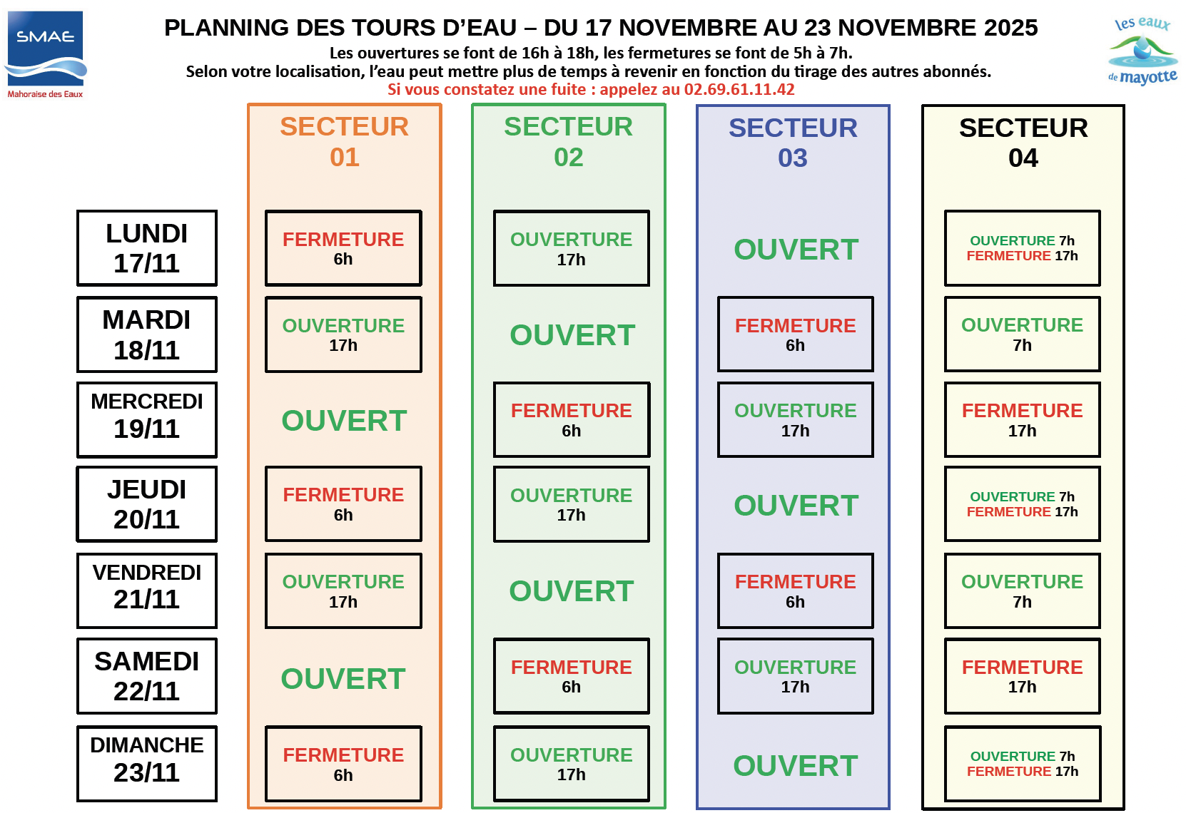 AccueilUnePLANNING DES TOURS D’EAU DU 10 NOVEMBRE AU 30 NOVEMBRE 2025 PLANNING DES TOURS D’EAU DU 10 NOVEMBRE AU 30 NOVEMBRE 2025 Une Publié le 7 novembre 2025 par La rédaction info976 FacebookTwitterPinterestWhatsApp Derniers articles Politique Mayotte : un nouvel arrêté encadre l’aide au retour des étrangers en situation irrégulière Un arrêté publié le 6 décembre 2025 au Journal officiel établit un nouveau cadre... 6 décembre 2025 Société C pas si loin met Mayotte à l’honneur sur le recensement « exceptionnel » Le magazine C pas si loin, présenté par Karine Baste, explore la réalité de... 6 décembre 2025 Economie Mayotte : la LODEOM avancée au 1er juillet 2026 L’Assemblée nationale a voté vendredi 5 décembre un amendement de la LODEOM visant à... 6 décembre 2025 Société Piton de la Fournaise : risque d’éruption, enclos fermé La préfecture de La Réunion a annoncé vendredi soir le passage en alerte 1... 6 décembre 2025 Plus d'articles Politique Mayotte : un nouvel arrêté encadre l’aide au retour des étrangers en situation irrégulière Un arrêté publié le 6 décembre 2025 au Journal officiel établit un nouveau cadre... 6 décembre 2025 Société C pas si loin met Mayotte à l’honneur sur le recensement « exceptionnel » Le magazine C pas si loin, présenté par Karine Baste, explore la réalité de... 6 décembre 2025 Economie Mayotte : la LODEOM avancée au 1er juillet 2026 L’Assemblée nationale a voté vendredi 5 décembre un amendement de la LODEOM visant à... 6 décembre 2025