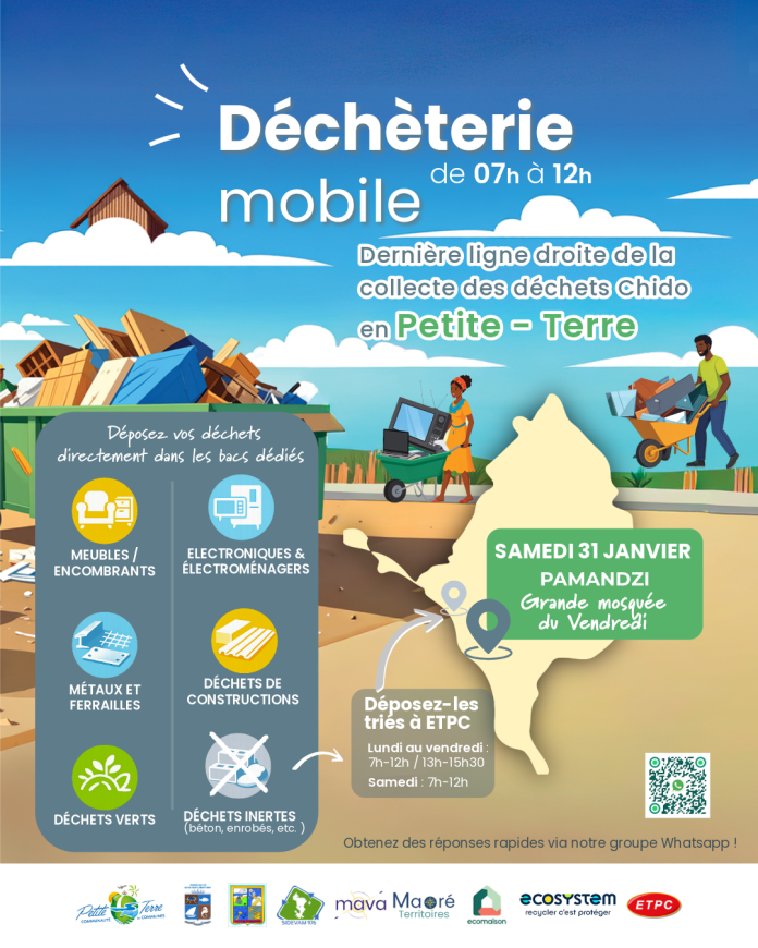 Après le succès du rendez-vous à Dzaoudzi-Labattoir, la Communauté de communes de Petite-Terre (CCPT) organise la dernière déchèterie mobile du mois, ce samedi 31 janvier, de 7h à 12h, sur la place de la Grande Mosquée du Vendredi à Pamandzi. Les habitants pourront y déposer meubles, encombrants, appareils électroniques et électroménagers, métaux, matériaux de construction ainsi que végétaux.