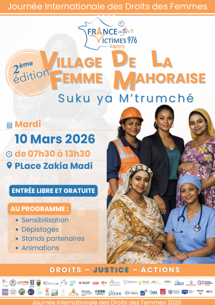 À l’occasion de la Journée Internationale des Droits des Femmes, l’ACFAV organise la 2e édition du Village de la Femme Mahoraise « Suku ya M’trumché », le mardi 10 mars 2026, de 07h30 à 13h30, sur la Place Zakia Madi à Mamoudzou.