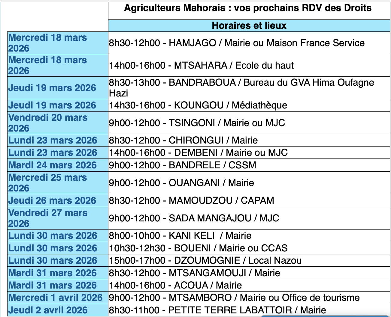 Du 18 mars au 2 avril 2026, la MSA d’Armorique/Mayotte invite à nouveaux les agriculteurs mahorais à des réunions d’information sur leurs droits.